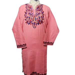 A Kashmiri pheran is a long, loose-fitting outer garment worn primarily in the Kashmir Valley. It is typically made from wool or a wool-blend fabric, designed to provide warmth in the region’s cold climate. The pheran features a straight cut with wide sleeves and often includes intricate embroidery or embellishments, reflecting the rich cultural heritage of Kashmir. Traditionally, it is worn over other clothing and can be adorned with beautiful needlework such as Sozni or Kani embroidery, making it both functional and a statement of local craftsmanship